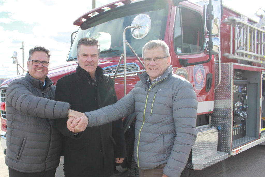 De gauche à droite : Les maires de L’Ange-Gardien, monsieur Pierre Lefrançois, de Boischatel, monsieur Benoit Bouchard, et de Château-Richer, monsieur Jean Robitaille, posent fièrement devant le nouveau camion pompe-citerne.